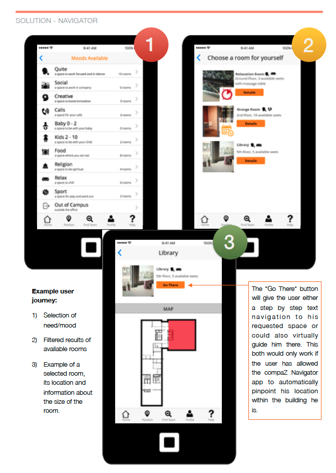 Inspired by the AHA moments, we explored diverse possibilities, from removing ratings to implementing offline orientation solutions like colored lines or areas on the ground. We also brainstormed add-on functionalities for the CompaZ Navigator, such as transportation booking features and guest registration capabilities.