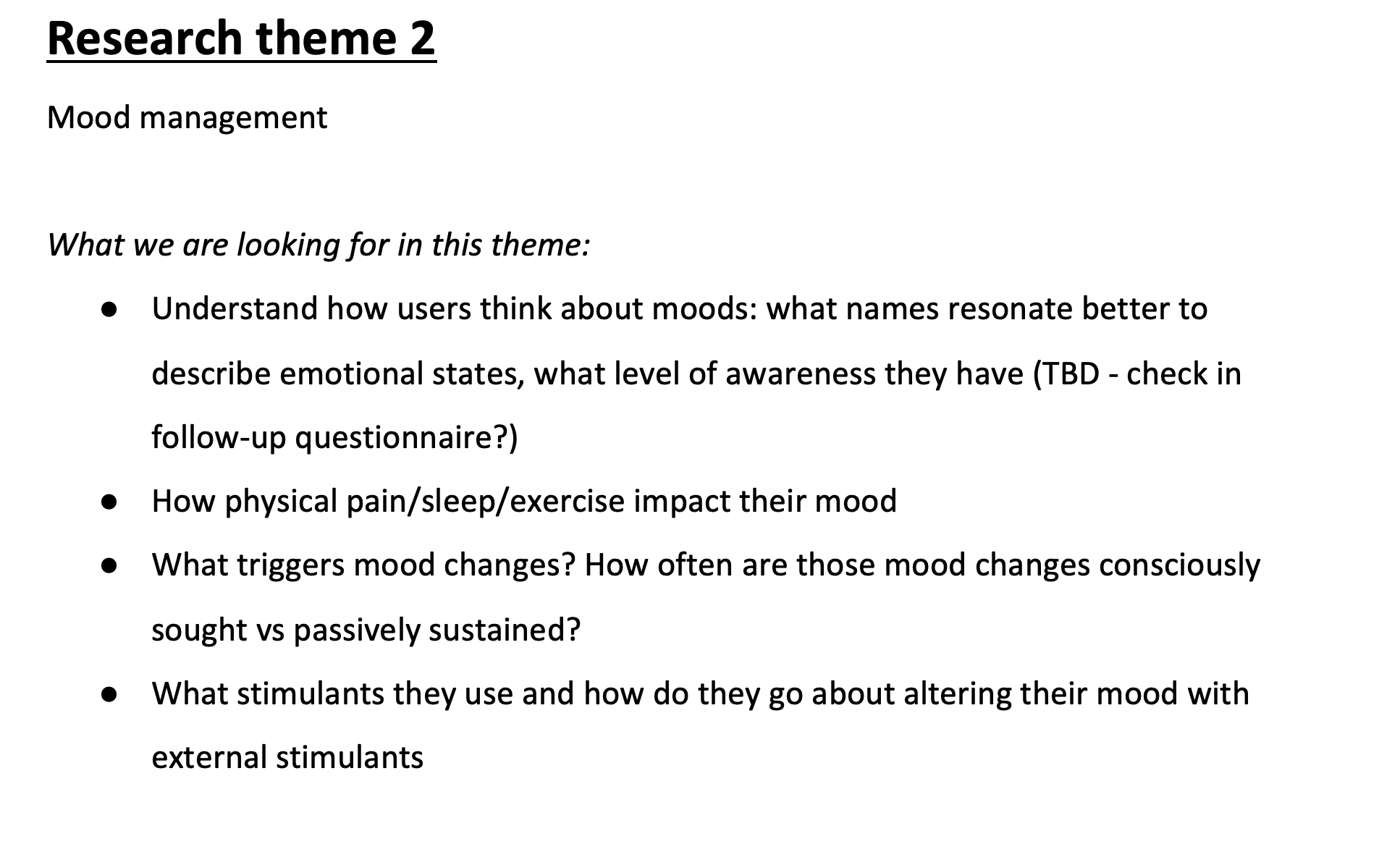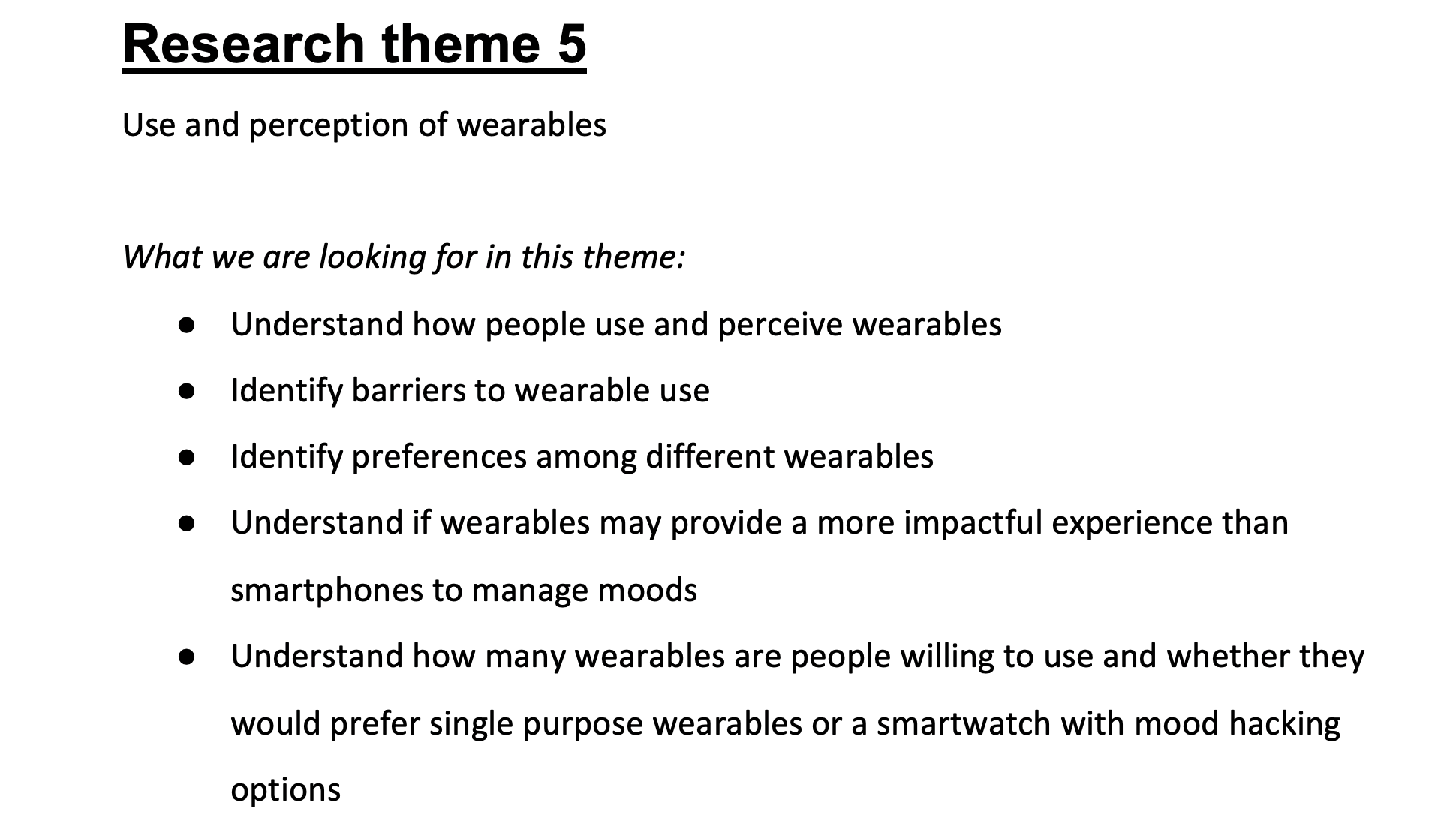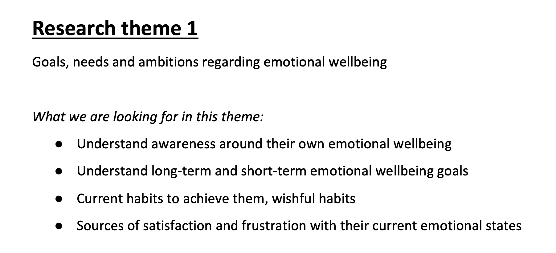 Objective: Enable client to identify and evolve relevant “in-the-go digital wellbeing solution pilots: How, if and why will individuals want to use, on an ongoing basis, a digital mood alteration solution?