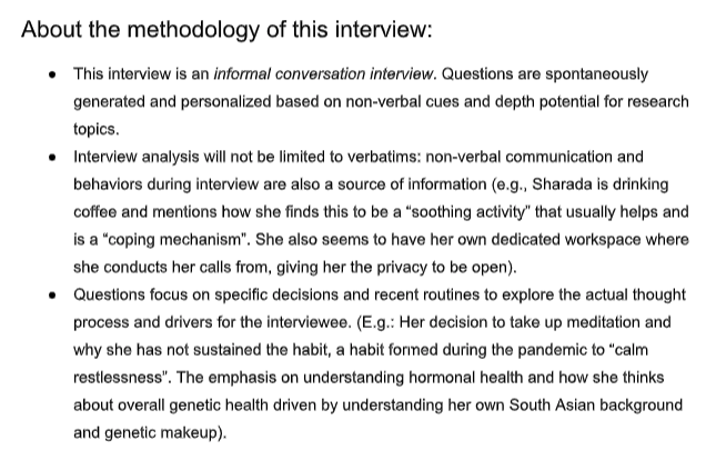 During the pre-interview phase, our team conducted thorough ethnographic and geographic research to gain insights into the cultural and behavioral nuances of our target audience. Drawing from this research, we collaboratively brainstormed and identified key research themes that would inform the development of our interview pathway and guide.