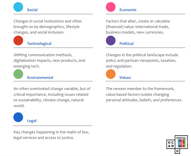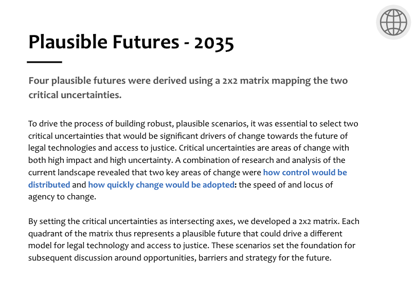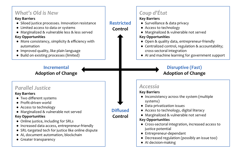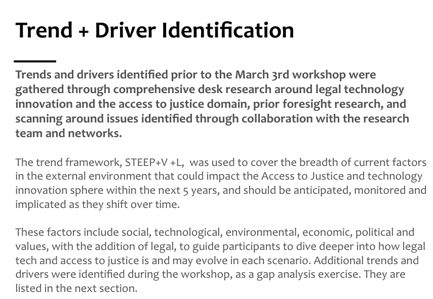 In this research project, we applied the discipline of Strategic Foresight to bring new thinking to entrenched, complex access to justice challenges, to help imagine new approaches to system change. Strategic foresight, combined with system and subject matter expertise has successfully been applied to advance projects in health, education and government sectors. It is commonly used across disciplines to understand the impact technological disruption will have in possible futures and to guide policy and planning to mitigate risk and increase the success in each future scenario, of environmental tensions and changes.