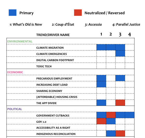 Workshops explored interactions of Trends and Drivers in scenarios addressing justice system tensions