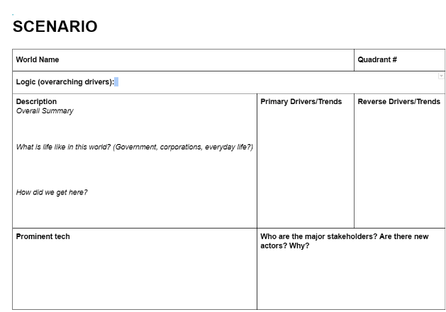 We gathered and analyzed all our data against the frameworks of the futures cone and the Horizon scan to come up with a 2x2 matrix to build out possible worlds.