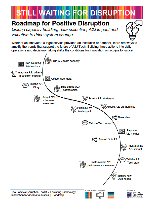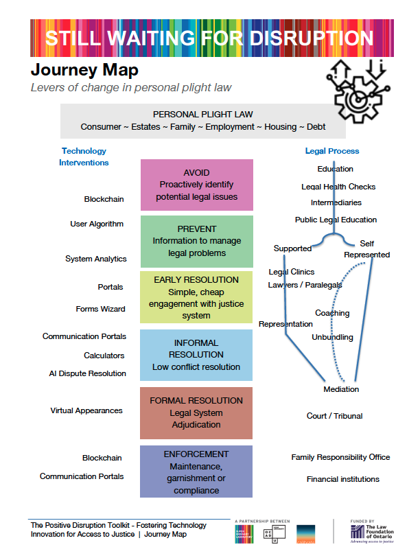 The toolkit that we have developed is meant to help foment current actions, and guide us collectively forward. Its tools are based on actions to support positive forces of change and to counteract those that would deter us from achieving better A2J. We look to change that will to move us out of the current scenario of tight controls and little adoption into a concerted opening up of the potential for innovation in the A2J space that would serve End Users, including SRLs, as well as the intermediaries and legal professionals that support them.